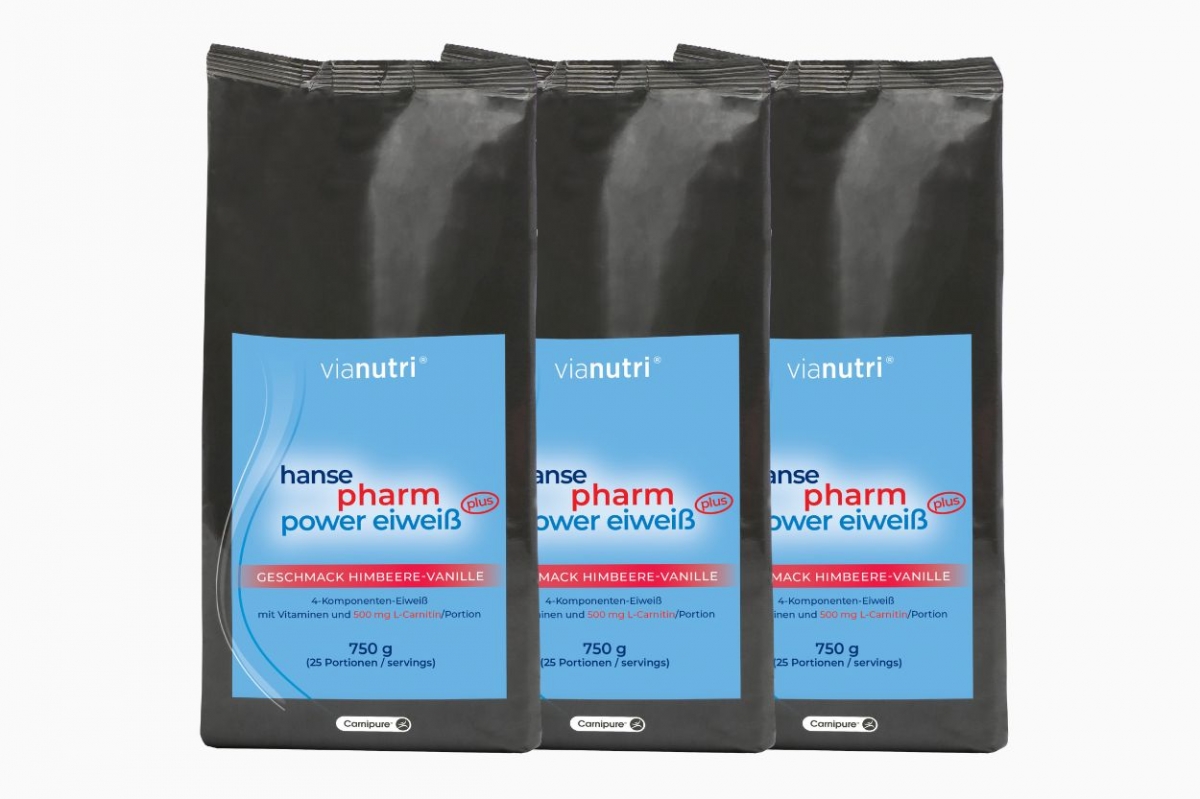 Dreierpack power Eiweiß plus von HansePharm 750 g 25 Portionen Geschmack Himbeere-Vanille jetzt online kaufen bei vianutri Vorteilspack