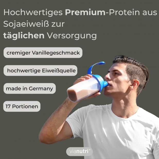 Sojaeiweißpulver (80%) mit Vitaminen und Mineralstoffen zur Herstellung eines Shakes. Mit Süßungs-mitteln. Verzehrsempfehlung: 1 – 2 Portionen am Tag