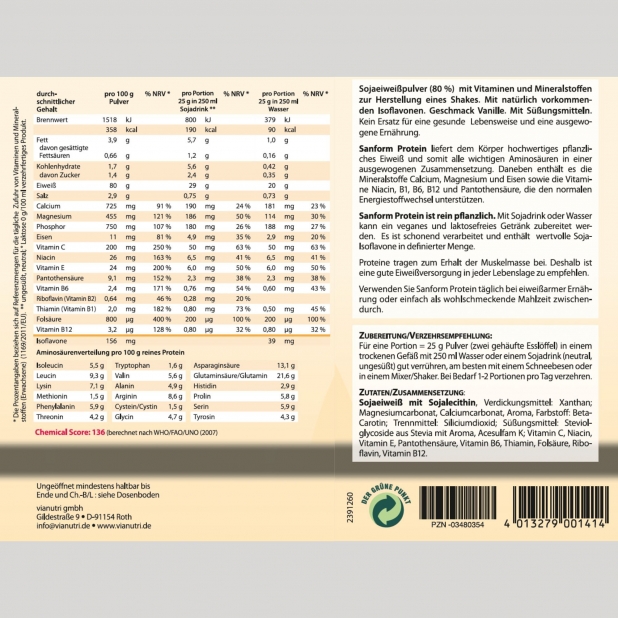 Soja, die Proteinquelle von sanform vegan Eiweiß, gehört zu den hochwertigsten Pflanzeneiweißen. In seiner biologischen Wertigkeit mit Milch oder Fleisch vergleichbar und es wird vom Körper gut verwertet. Die hier verwendeten Sojabohnen sind nicht gentechnologisch verändert. Die besonders schonende Herstellung sorgt dafür, dass die natürlichen Sojaisoflavone erhalten bleiben.