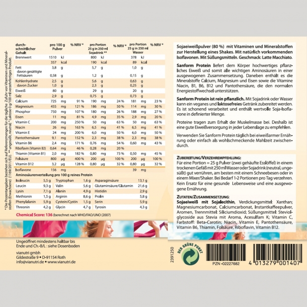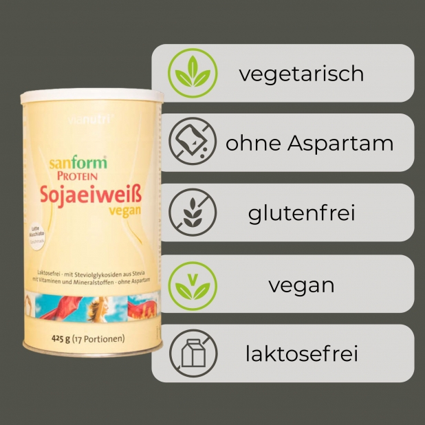 Soja, die Proteinquelle von sanform vegan Eiweiß, gehört zu den hochwertigsten Pflanzeneiweißen. In seiner biologischen Wertigkeit mit Milch oder Fleisch vergleichbar und es wird vom Körper gut verwertet. Die hier verwendeten Sojabohnen sind nicht gentechnologisch verändert. Die besonders schonende Herstellung sorgt dafür, dass die natürlichen Sojaisoflavone erhalten bleiben.