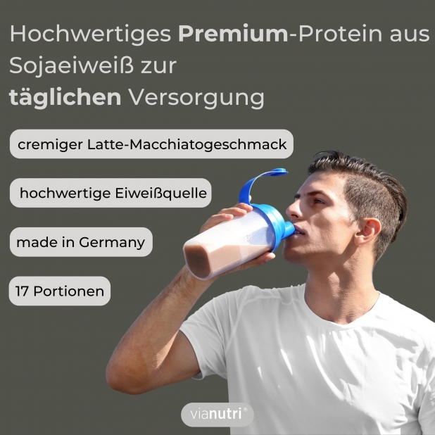 Sojaeiweißpulver (80%) mit Vitaminen und Mineralstoffen zur Herstellung eines Shakes. Mit Süßungs-mitteln. Verzehrsempfehlung: 1 – 2 Portionen am Tag